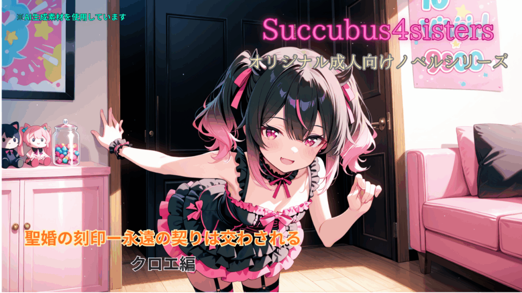 ❤末女クロエとの出会い Uncategorized X Facebook はてブ LINE Pinterest コピー 2025.11.122025.11.29 お菓子の匂いに誘われて部屋に入ると、そこはまるで夢の国みたいな空間。ソファーに寝転んだ小さな少女が、足をバタバタさせながら笑っていた。黒髪のツインテールの先にピンクの差し色。キャンディを咥えた口元が、にやっと歪む。 クロエ:「やっほー! あたいはクロエ。遊んでくれる? じゃなきゃイタズラしちゃうぞ❤」(パ、パンツ……見えてる……!?)(か、かわいいけど危なすぎる! 心臓がもたない!)こうして俺は末女クロエと刺激的な出会いを果たした。――まるで天使と悪魔を足して、全部甘くしたような少女。笑うたび、理性が少しずつ溶かされていく。この瞬間から、もう彼女には逆らえない気がした。甘い罠の始まりに、俺は気づかぬまま足を踏み入れていた。 👉続きはこちら
